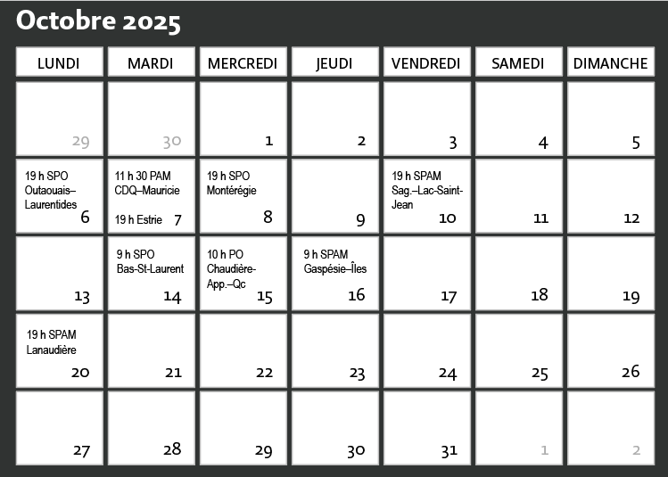 Si votre région ne figure pas dans ce calendrier, c'est que le syndicat n'a pas transmis ses informations à LEOQ.